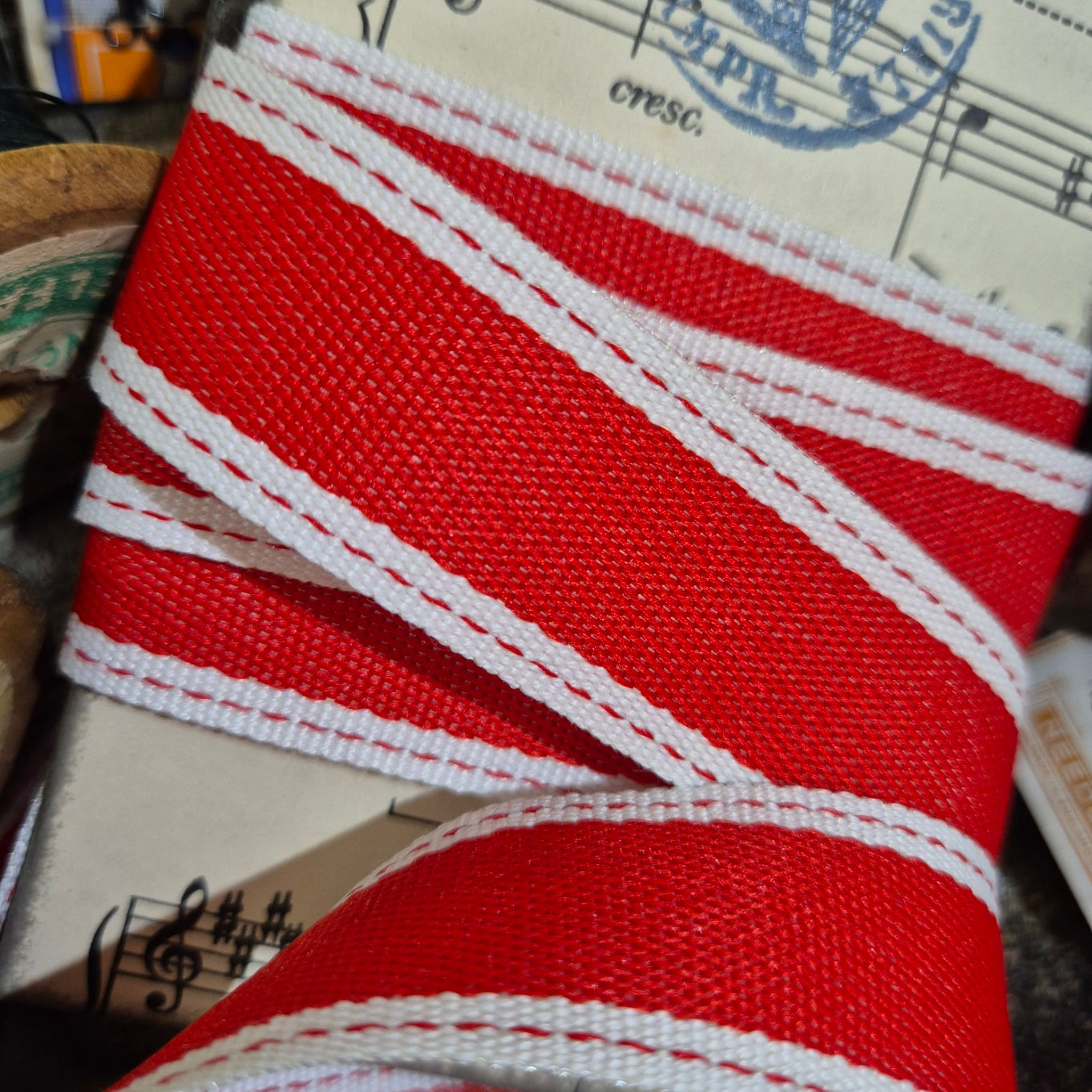 A classic cotton ribbon with a wide stripe and a ticking stripe down each side. Ideal for sewing crafts, junk journals, slow stitching and scrapbooking projects. Embellish cushions and home decor projects.