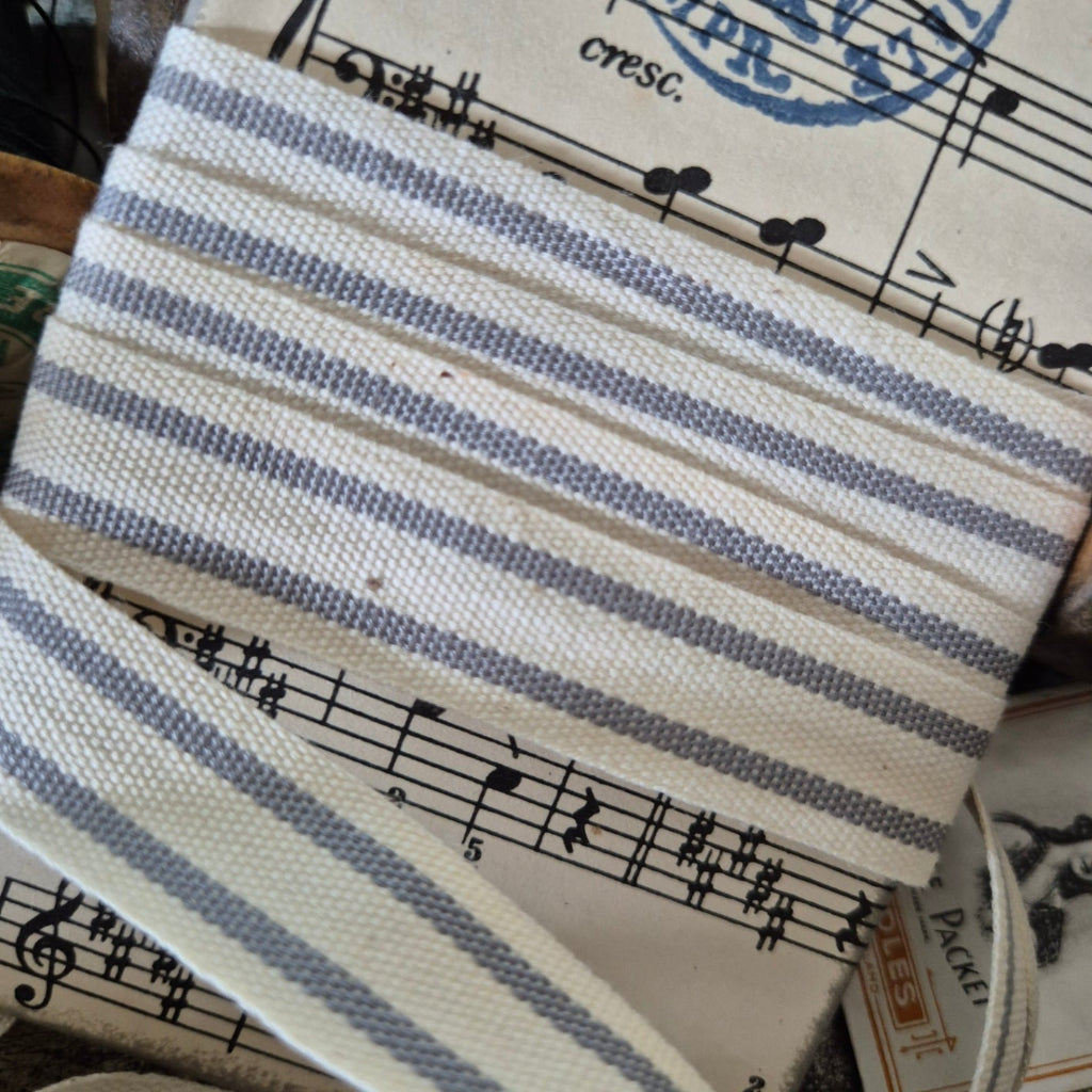 A classic woven cotton ribbon in cream with a faded burgundy double woven stripe. This ribbon is ideal for sewing crafts, junk journals, slow stitching and scrapbooking projects and home decor projects.