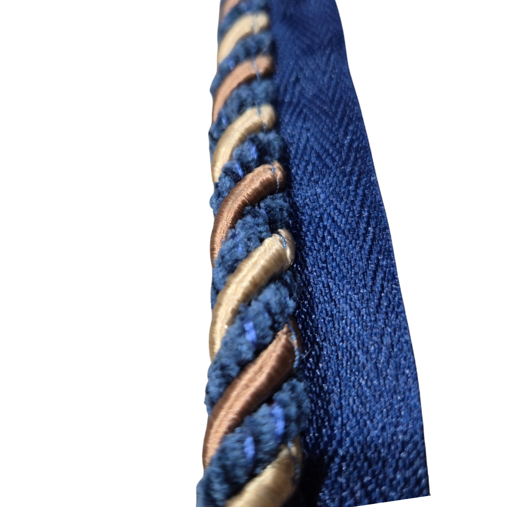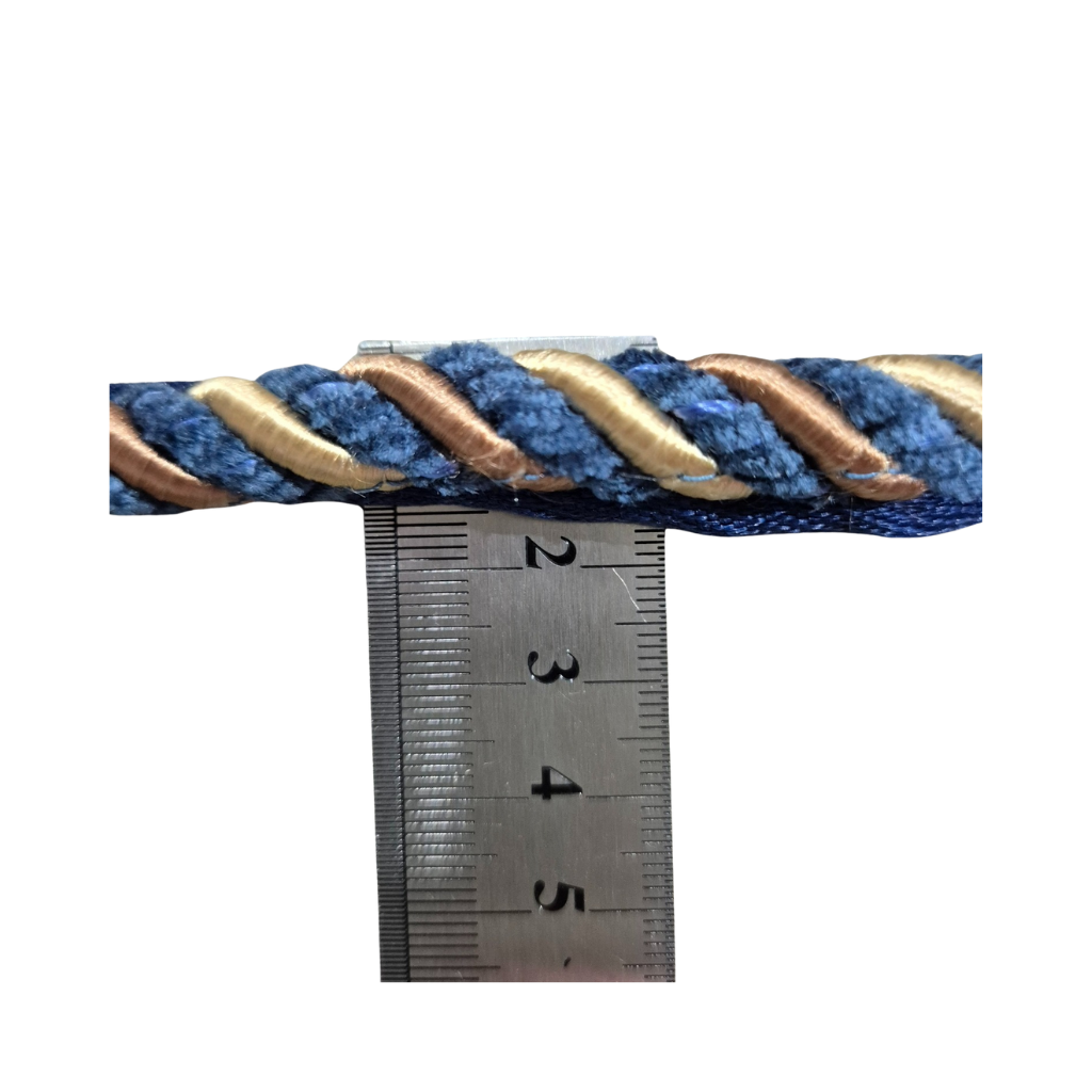 A classic navy twisted cord trim, with tones of gold and bronze. A larger braid suitable for sewing projects including cushions, squabs and upholstery.
