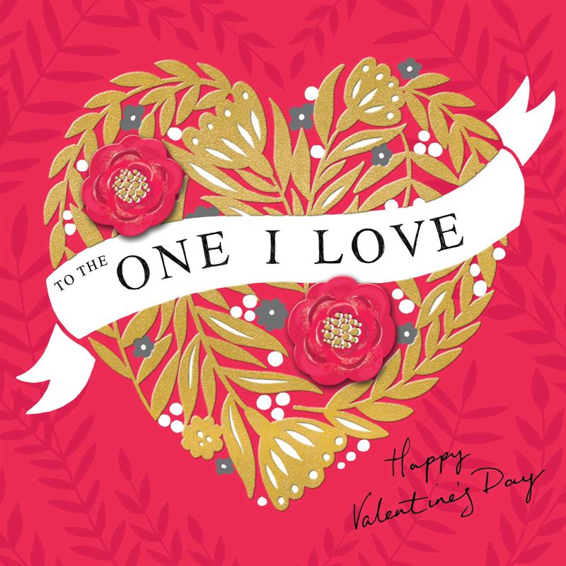 A beautiful and striking, romantic Valentine’s Card featuring detailed gold foiling and a 3D flower hand-applied attachment. The wording is ‘To the one I love Happy Valentine’s Day’