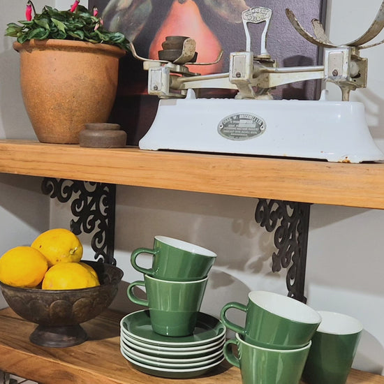 Bring authentic farmhouse charm into your kitchen with this timeless metal scale. Featuring a sturdy cast iron foundation and complete with five weights, it's the perfect piece to capture that vintage aesthetic. Whether you're a collector of nostalgic kitchen treasures or simply seeking to infuse your space with rustic character, this classic scale delivers nostalgic appeal for a genuinely lived-in farmhouse atmosphere.